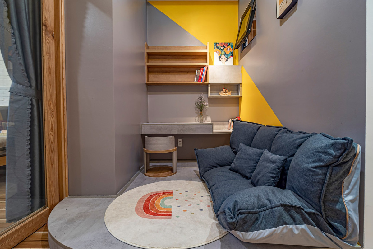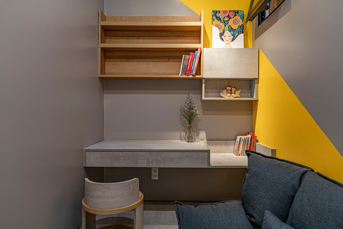 Góc học tập và đọc sách thật chill. Khu vực này được chị Dung làm nền cao hơn mặt sàn. Mảng màu sắc sau ghế nổi bật trên nền nội thất màu xám.