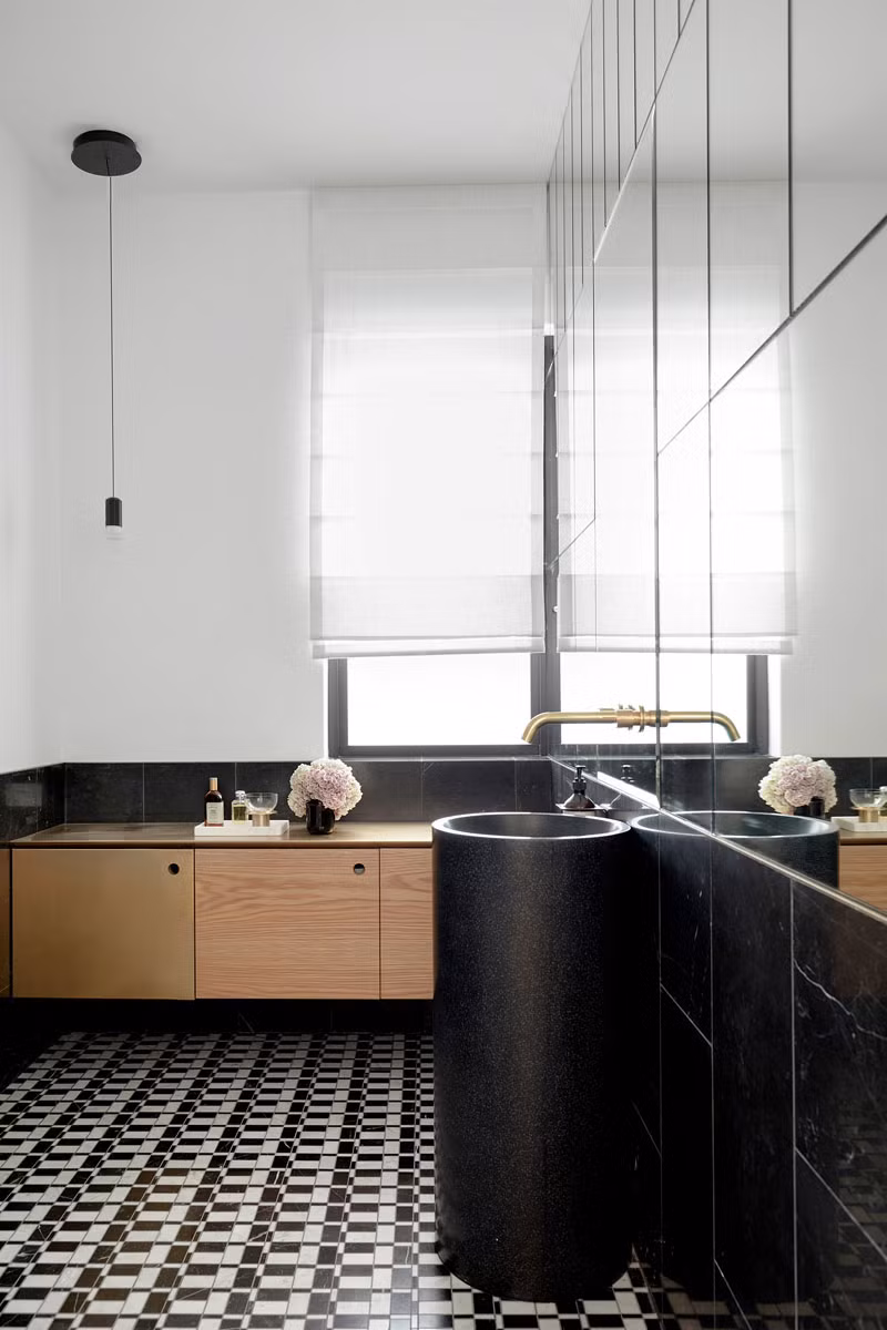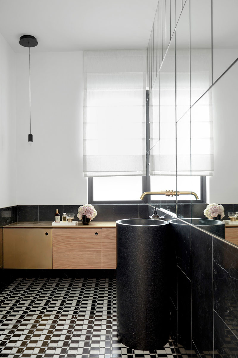 Ngôi nhà có hai phòng tắm. Trong phòng tắm này, gia chủ sử dụng một chiếc gương che toàn bộ phần tường phía trên, phản chiếu ánh sáng từ cửa sổ lên những món đồ nội thất chủ yếu là trắng và đen. Với phòng tắm còn lại, những viên gạch lát màu xanh lá cây được sử dụng để tạo tường điểm nhấn đằng sau những chiếc gương dài.