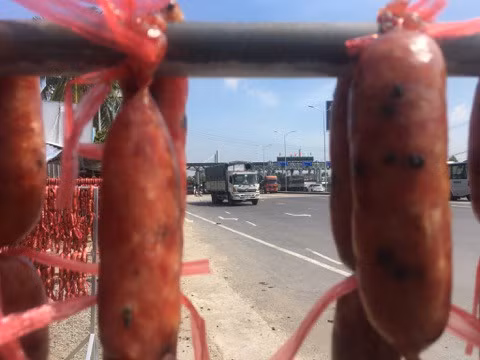 Kể từ khi trạm thu phí Cai Lậy (BOT Cai Lậy) thu phí trở lại vào ngày 30-11 tới nay, những người bán thịt heo kiêm luôn bán lạp xưởng tươi tự chế biến tại chỗ đã "hốt bạc" do lượng người và xe dừng lại xung quanh trạm BOT này ngày càng đông.