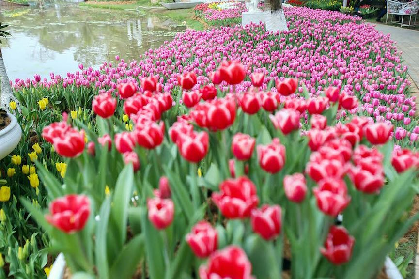 Hoa tulip được trồng thành từng thảm hoa trải dài, tạo nên cảnh sắc của một chốn thiên đường mộng mơ, tràn đầy sức sống.