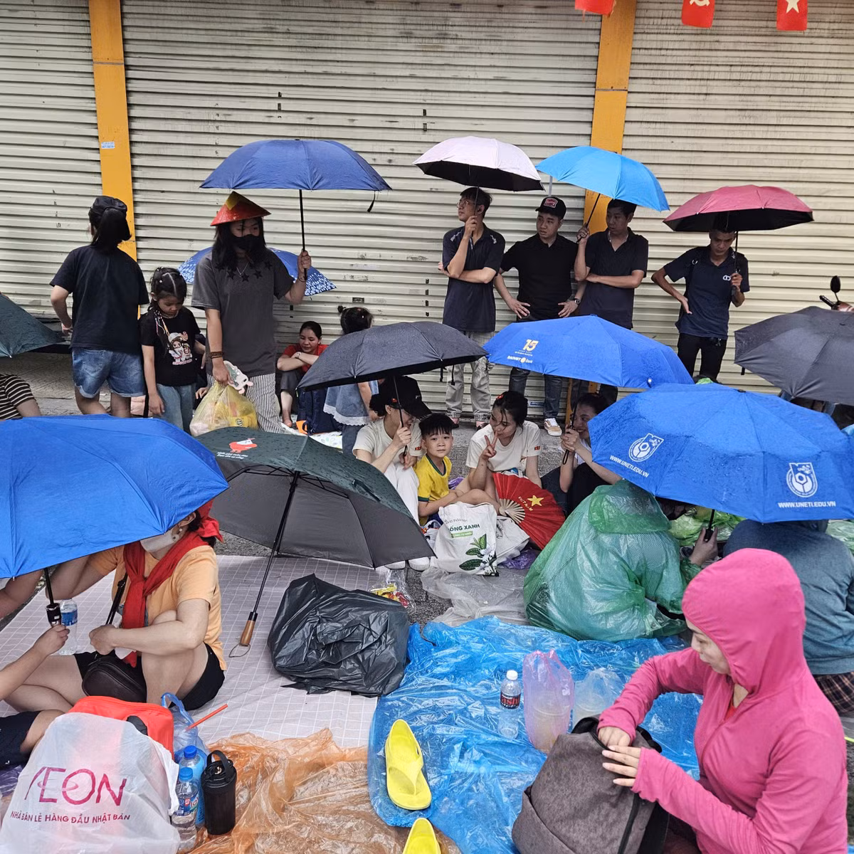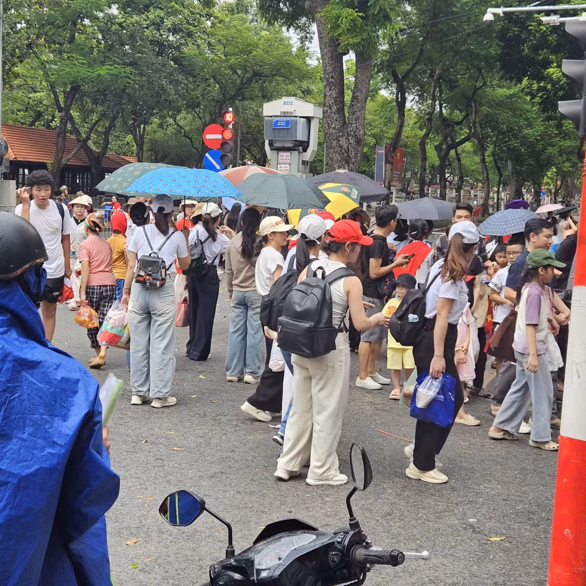 Cơn mưa dông bất ngờ đổ xuống Hà Nội sau trận nắng buổi sáng. Dù vậy, người dân vẫn kiên trì đợi xem màn hợp luyện diễu binh, diễu hành A80 diễn ra tối nay.