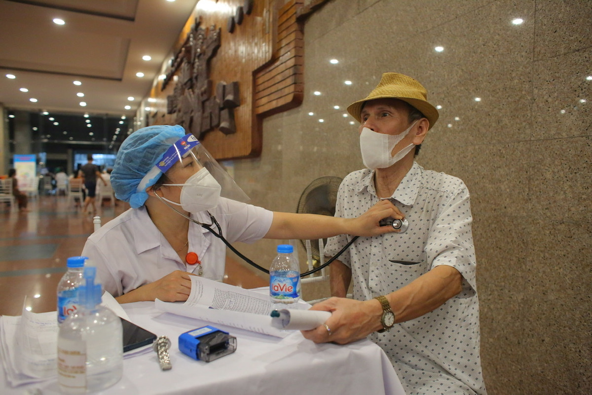 Những người đến tiêm được kiểm tra sức khoẻ trước khi vào tiêm.