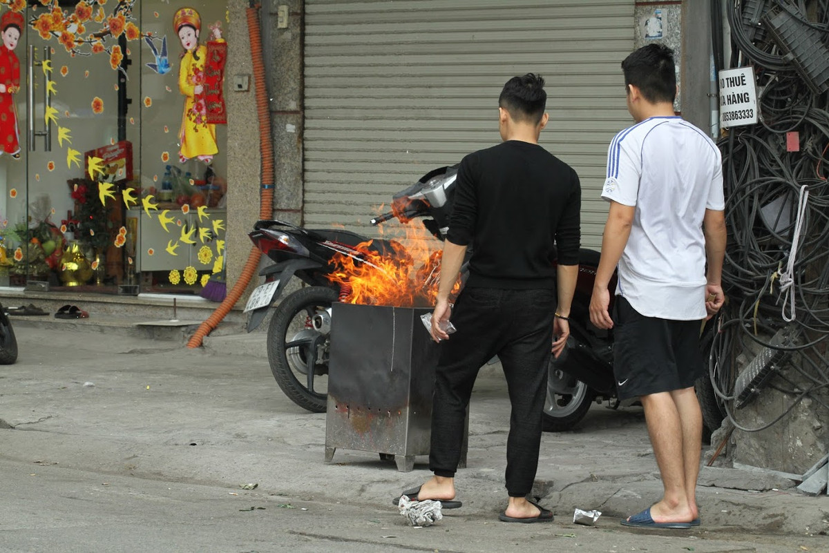 Chính vì vậy, chiều 30 Tết ở Hà Nội, sau khi mâm cúng Tất niên được hạ xuống khỏi bàn thờ, nhiều gia đình đã ra đường để hóa vàng mã.