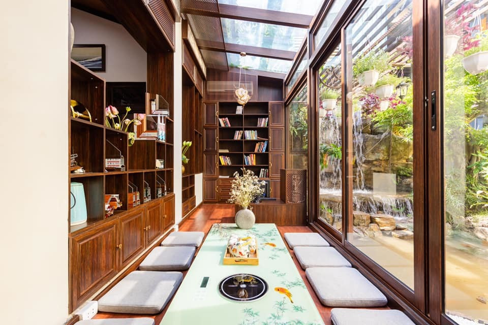Hiên nhà đọc sách, uống trà đạo kiểu Nhật.