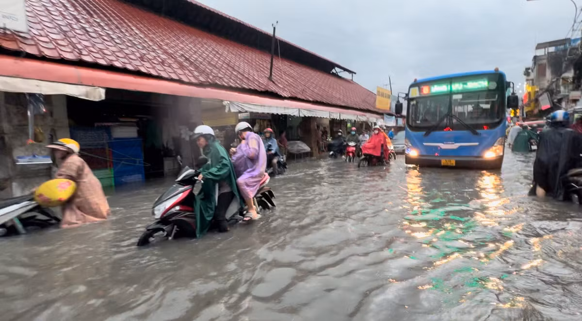 Đúng vào giờ học sinh tan học, người đi làm tan ca nên việc đi lại của người dân vô cùng khó khăn di chuyển trong biển nước.