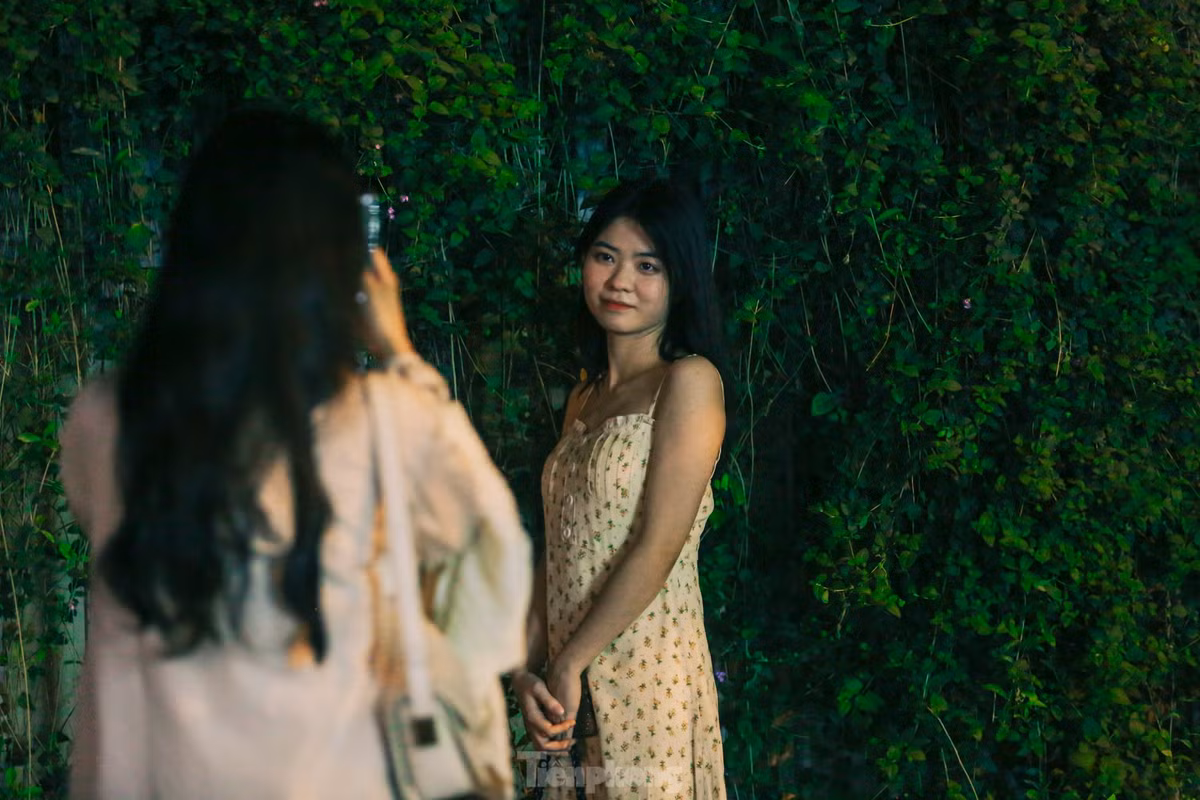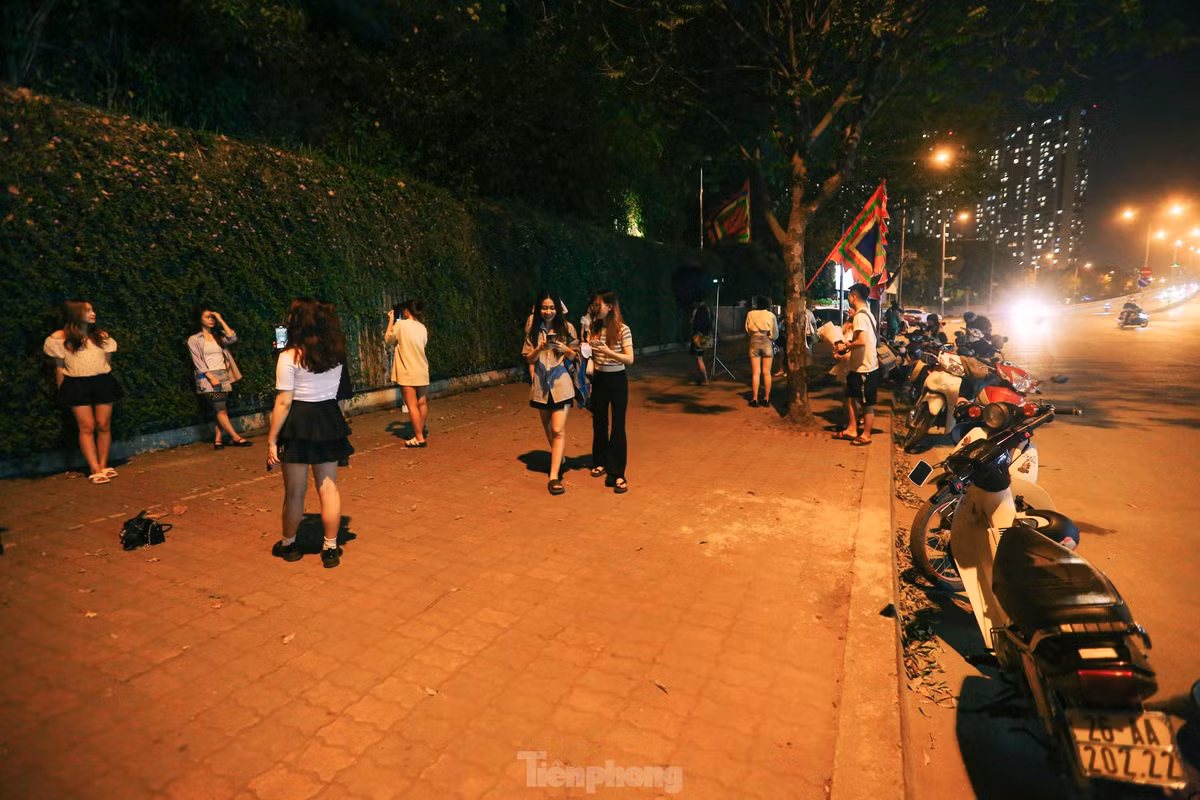 Mặc dù nửa đêm nhưng nhiều người dân vẫn đổ xô đến bức tường với giàn hoa ngũ sắc ở phố Miếu Đầm (quận Nam Từ Liêm, Hà Nội) để chụp ảnh, "sống ảo".
