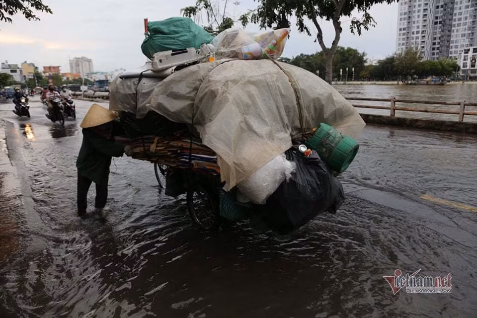 Người dân TP.HCM ngã sõng soài trên đường ngập do triều cường vượt báo động