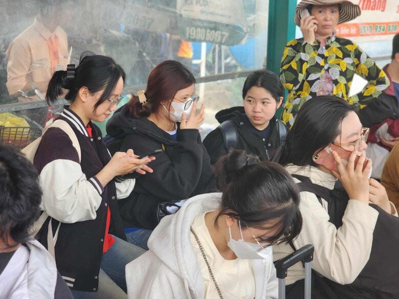 Hành khách ngồi chờ kín các dãy ghế bên trong sảnh chờ mua vé. Trong lúc chờ đợi, hành khách ngồi vật vã, đọc sách, lướt mạng xã hội chờ đến lượt khởi hành.