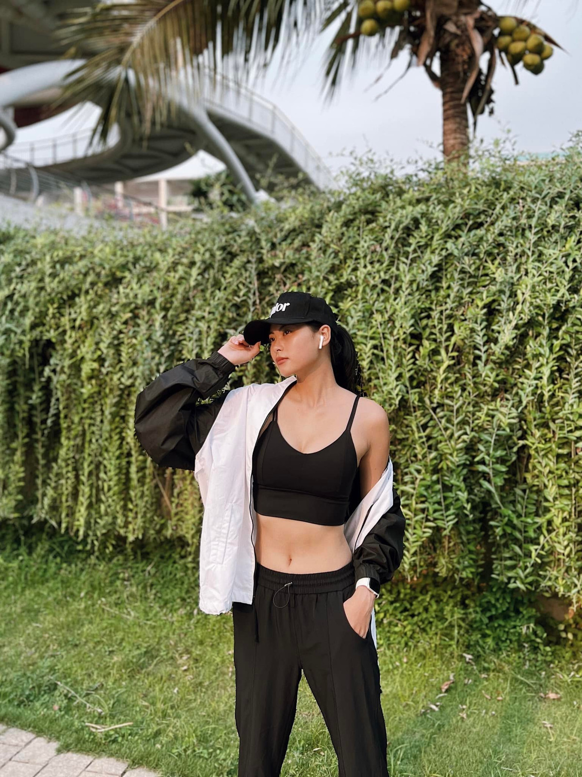 Khi tập luyện ngoài trời, Đào Thị Hà diện áo croptop kết hợp với quần jogger thoải mái. Cô không quên mặc chiếc áo khoác gió và đội mũ lưỡi trai.