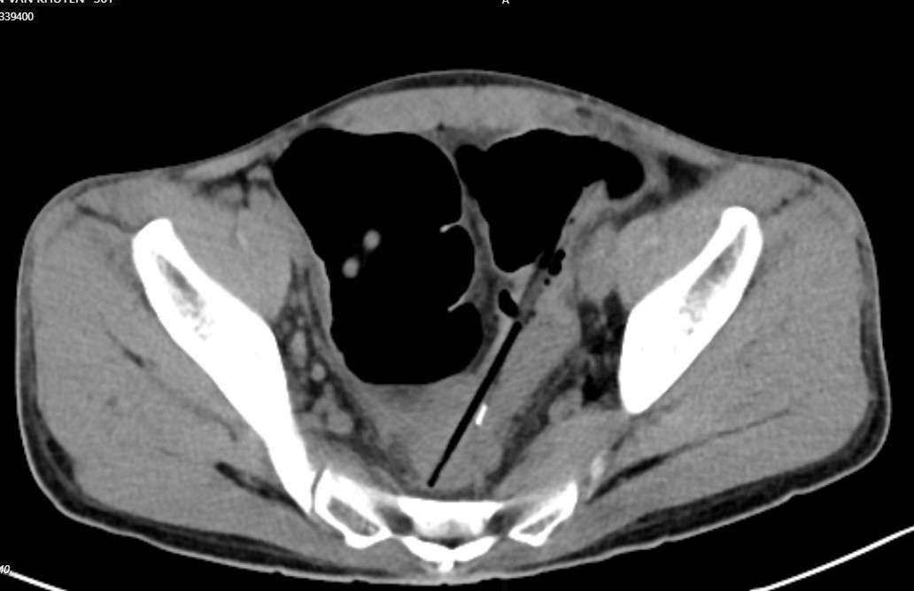 Chụp cắt lớp ổ bụng thấy hình ảnh 02 dị vật hình que đầu kim loại trong quai ruột vùng hạ vị, đâm xuyên thành ruột tạo ổ dịch khí vùng tiểu khung cạnh cơ bịt phải; Dị vật trong quai ruột hạ sườn phải; Dày thành trực tràng, đại tràng sigma và quai ruột ngang rốn; Giãn lan tỏa các quai ruột non.
