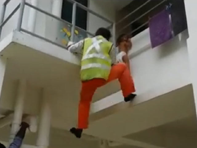 Bé trai 4 tuổi cố gắng dùng tay bám vào gờ bên ngoài ban công của một căn hộ trên tầng 4 của tòa nhà chung cư ở quận Rue Marx-Dormoy, Paris, Pháp. Em bé ra ngoài ban công chơi, sau khi bị bố để ở nhà một mình trong lúc anh ta đi mua sắm.