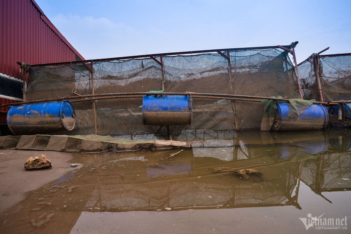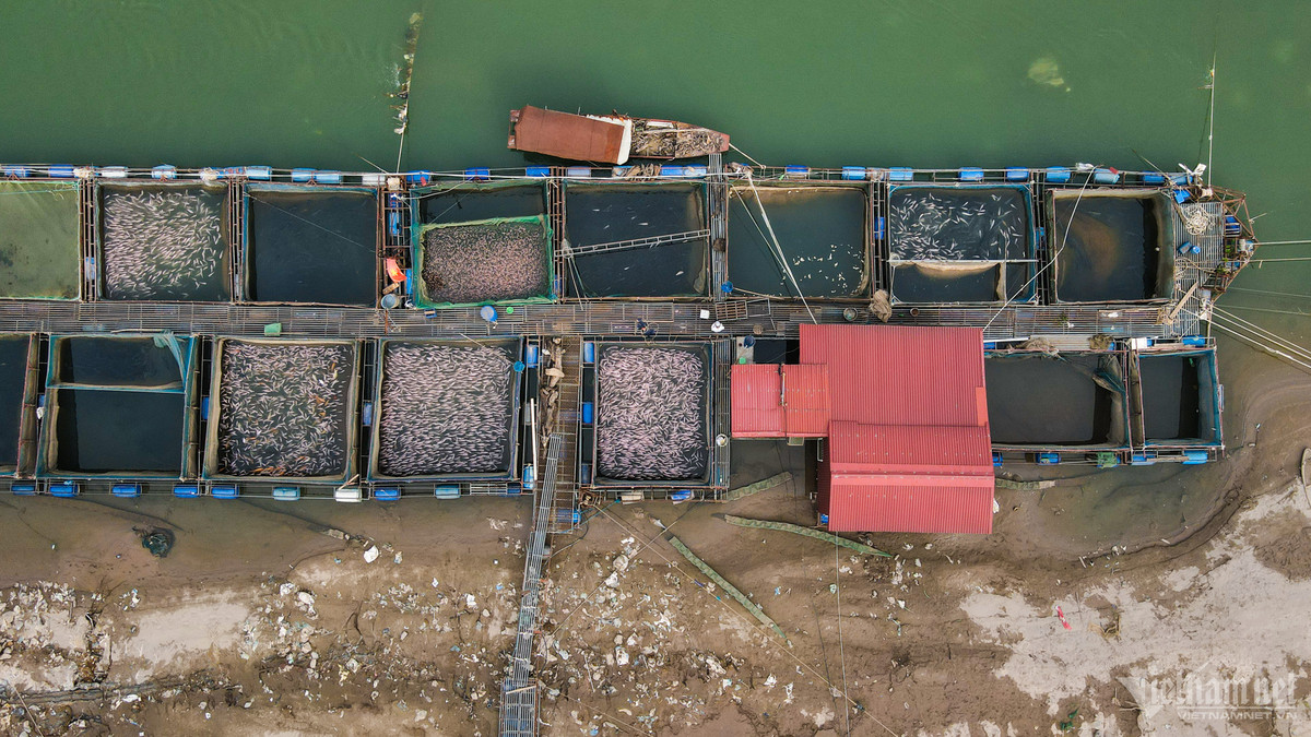 Những lồng cá diêu hồng của gia đình ông Hướng phải gộp đàn, nhấc nghiêng để dồn nước và dùng 6-7 máy bơm hút cát ra ngoài kèm sủi để cung cấp oxi. Buốt ruột, ngày nào ông Hướng cũng lên mạng xem thông báo xả nước của đập thủy điện Hòa Bình.