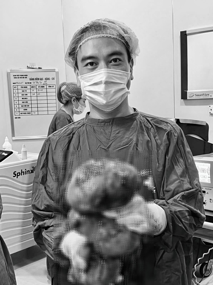 Ca mổ kéo dài nhiều giờ, bệnh nhân mất máu đáng kể, được truyền bổ sung 2 đơn vị máu trong quá trình phẫu thuật. Khối u nặng hơn 9kg, dịch ổ bụng khoảng 3 lít đã được loại bỏ.