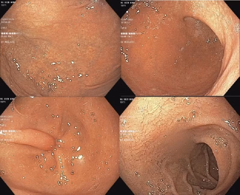 Nội soi thực quản cho thấy, niêm mạc thực quản phù nề, mất mạng lưới mạch bình thường, xuất hiện nhiều vòng đồng tâm, rãnh dọc sâu dọc theo chiều dọc thực quản, kèm theo các chấm trắng nhỏ rải rác trên bề mặt niêm mạc. Các tổn thương này là hình ảnh đặc trưng của viêm thực quản tăng bạch cầu ái toan. Bác sĩ đã sinh thiết lấy mẫu mô thực quản để làm giải phẫu bệnh và kết quả phù hợp với viêm thực quản tăng bạch cầu ái toan. Cùng với đó, kết quả nội soi dạ dày có viêm teo dạ dày (C1).