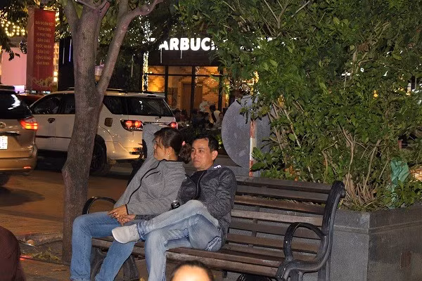 Tại phố đi bộ Nguyễn Huệ, không gian khá 'lạ lẫm' so với ngày thường khi các bạn trẻ diện đồ ấm áp dạo phố, các cặp đôi nắm chặt tay nhau và lâu lâu lại xuýt xoa vì thời tiết se lạnh hiếm có.