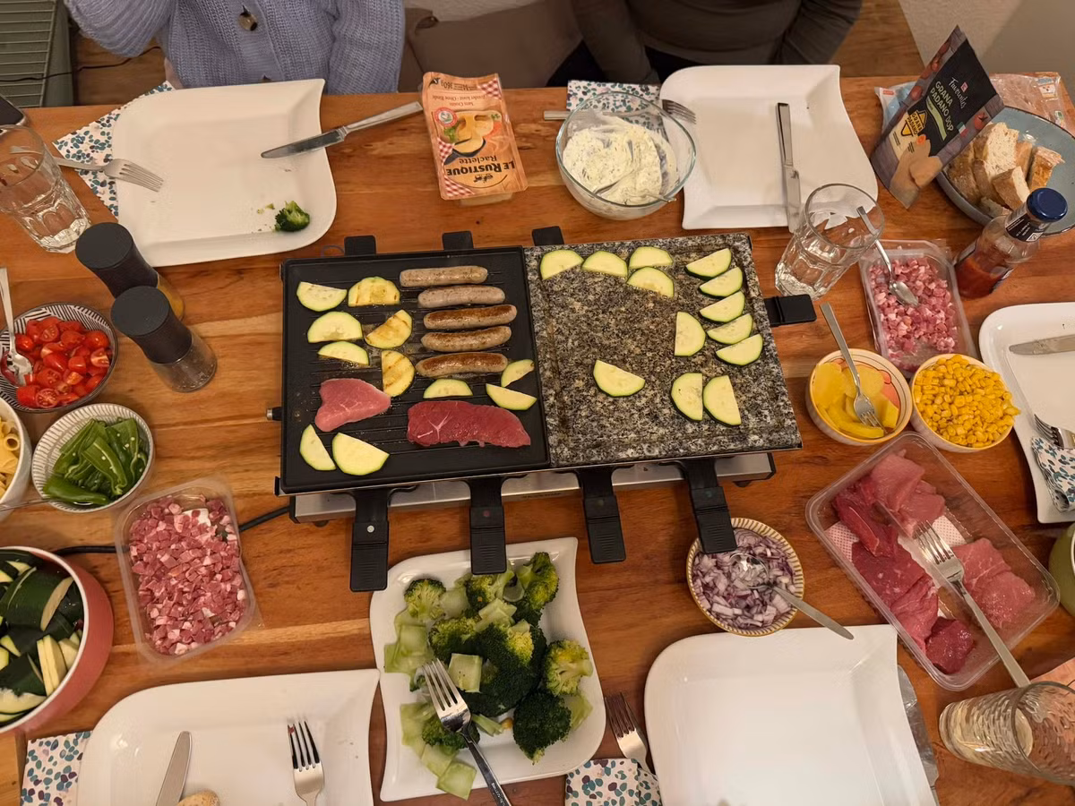 Món Raclette ở Đức gồm nhiều loại nguyên liệu khác nhau như khoai tây, dưa chuột muối, thịt nguội, ớt chuông, nấm xào, bánh mì, xúc xích… Khách có thể tự trải nghiệm đồ yêu thích trong những chiếc chảo nhỏ đặt trên bàn tiệc.
