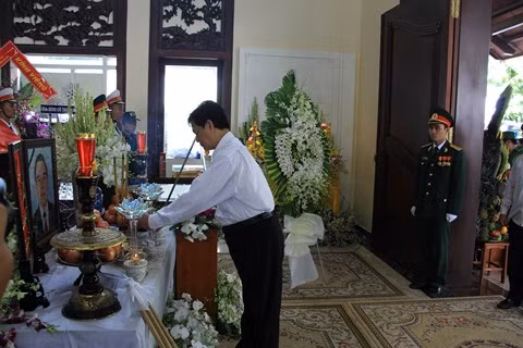 | Nguyên Thủ tướng Nguyễn Tấn Dũng thắp hương trước linh cữu cố Thủ tướng Phan Văn Khải. |