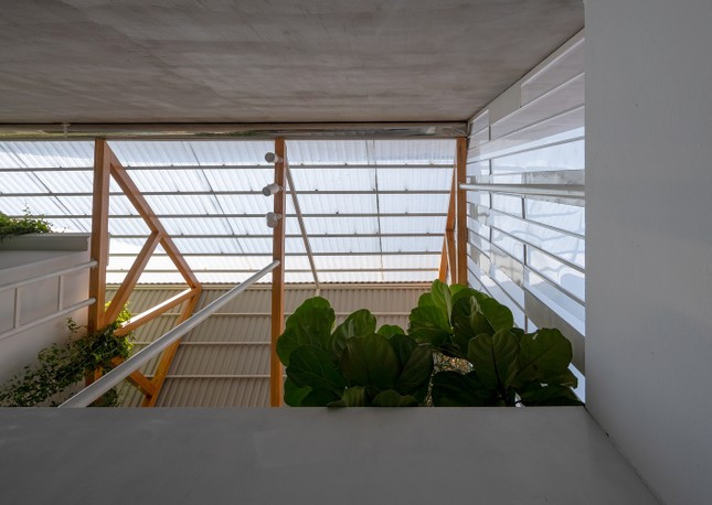 Phần vườn áp mái liền kề với phòng làm việc, một nửa mái chéo được làm từ tấm lợp trong suốt để lấy ánh sáng cho các khoảng xanh và tạo cảm giác không gian được mở rộng.
