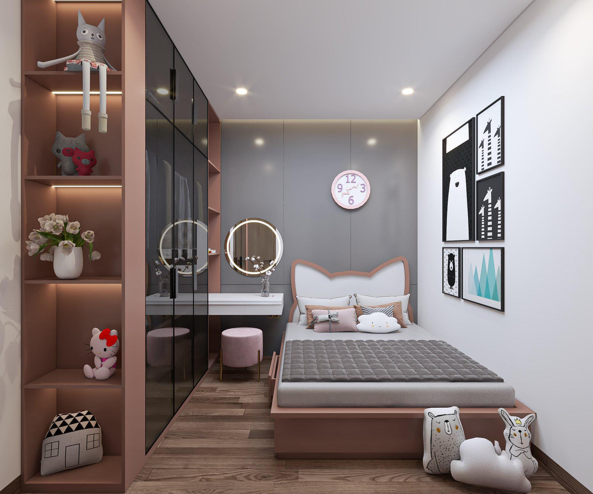 Phòng ngủ cho bé gái với gam màu hồng pastel và đồ decor ngộ nghĩnh. Ngôi nhà được xây dựng lên để đáp ứng nguyện vọng của chủ nhân về một nơi “trú ẩn”, nơi mà gia đình có thể quây quần bên nhau.
