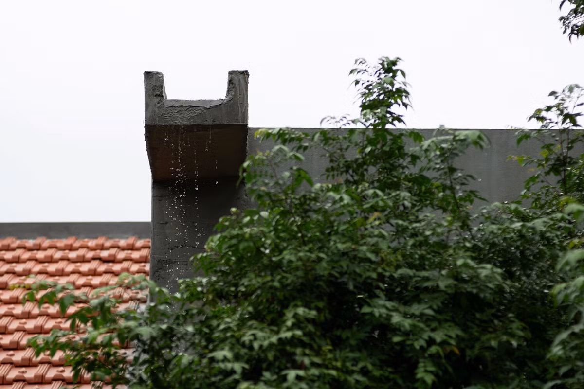 Các cành cây vươn ra qua một lỗ hình chữ nhật trên mái nhà, đưa không gian ngoài trời vào nhà, tăng cường cảm giác rộng mở, cho phép ánh sáng và không khí tự nhiên tràn vào các khu vực sinh hoạt.