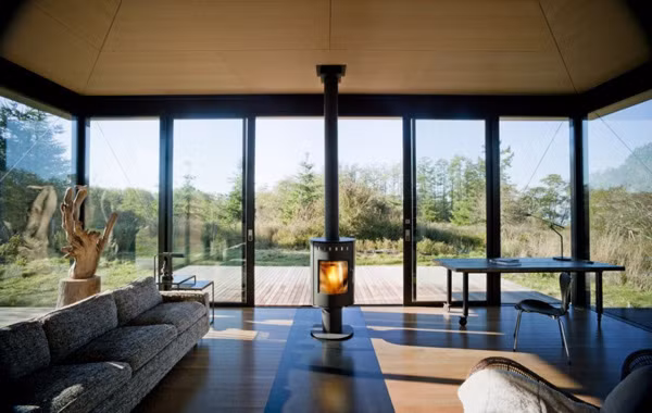 Tường gỗ tạo một không gian riêng tư cho ngôi nhà, khi tường gỗ hạ xuống sẽ có tường kính tạo một không gian mở, thư thái hòa nhập với thiên nhiên xung quanh.