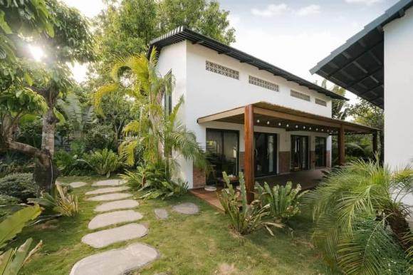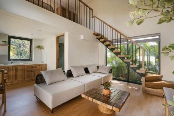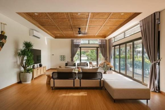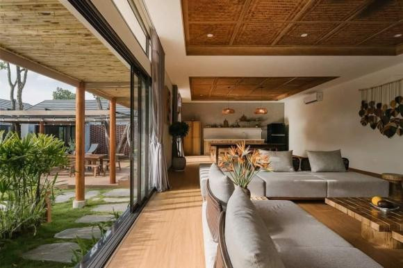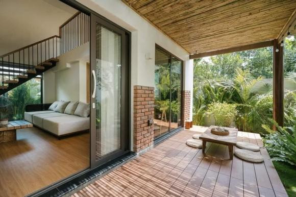 Mái hiên bằng tre tự nhiên cũng tô điểm thêm nét mộc mạc cho ngôi nhà. Phần nội thất của các phòng cũng đồng điệu với tổng thể thiết kế với nhưng vật liệu gỗ tự nhiên, gỗ công nghiệp, mây tre đan được phối hợp hài hòa, nhẹ nhàng.