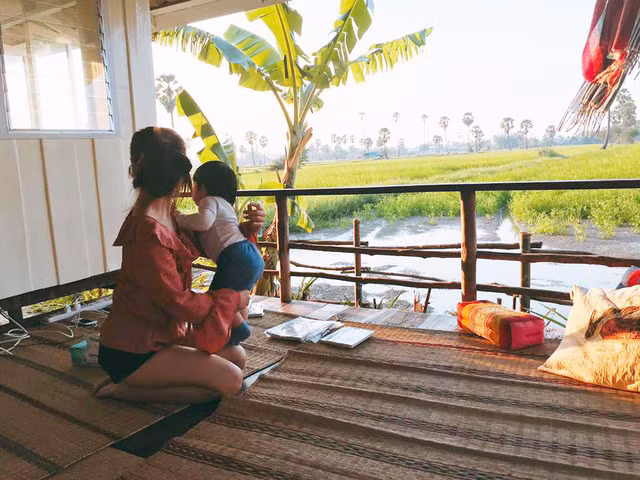 Bức ảnh người vợ đang ngồi ôm con nhỏ - có lẽ là đang đợi chồng, mắt nhìn về cánh đồng mênh mông xanh ngát phía xa càng khiến cho những người xem ao ước được đến đây tận hưởng không gian đồng quê một lần, quên hết đi mọi muộn phiền của cuộc sống.
