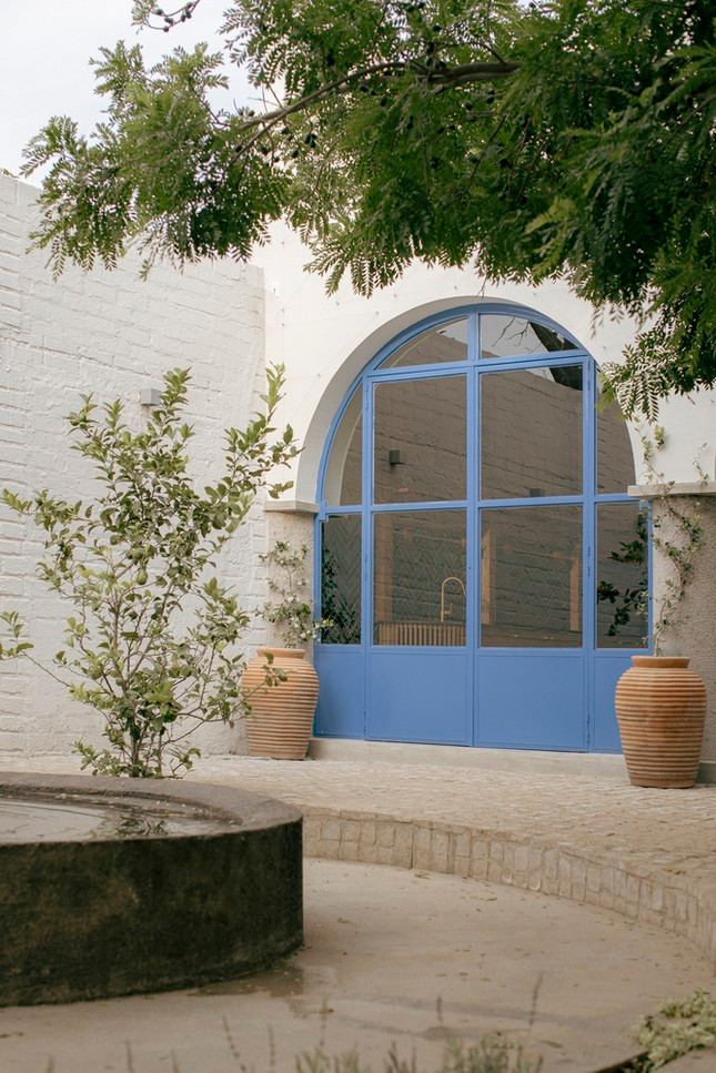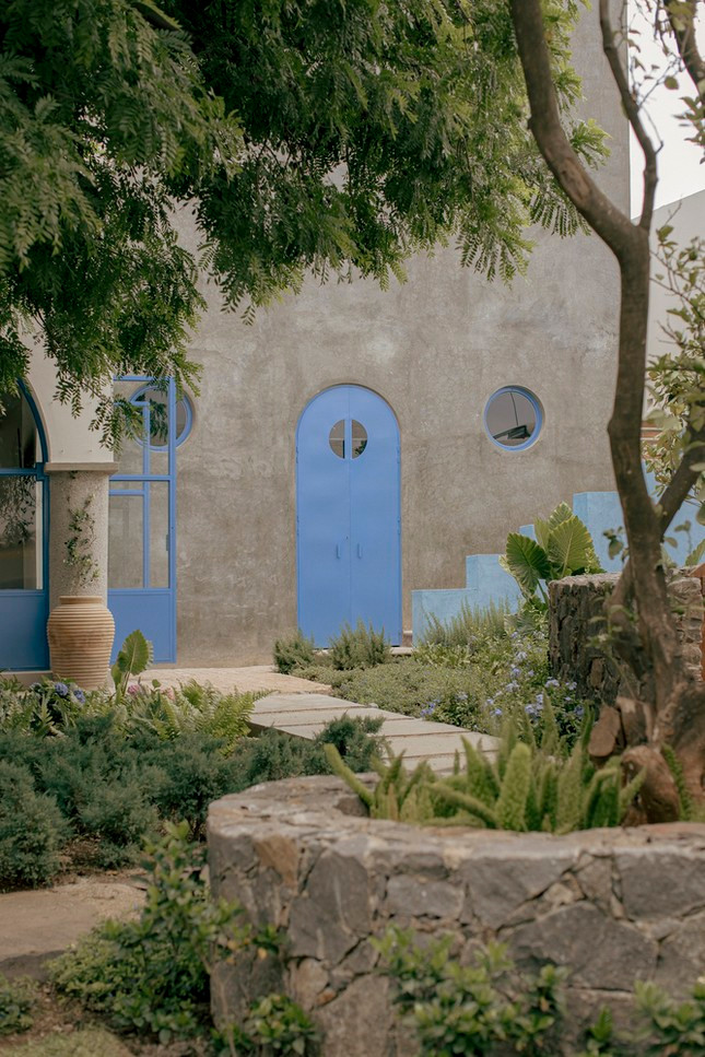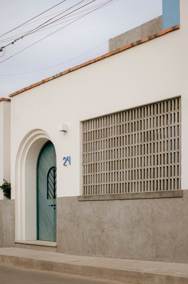 Căn nhà có mặt tiền "kín cổng cao tường" nhưng không hề gợi cảm giác "xa cách" bởi đường nét tối giản và sự phối trộn tinh tế giữa sắc trắng, lam gần gũi.