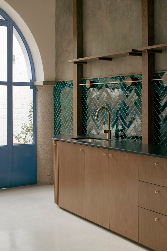 Bố cục căn nhà được chia làm hai phần với không gian sinh hoạt riêng tư chính ở phía trước và sân vườn, phòng khách lớn có lò sưởi ở phía sau phục vụ cho nhu cầu giải trí của gia chủ. Các vật liệu được sử dụng như gạch, ngói và sàn đất sét đều được sản xuất tại địa phương, tạo nên sự hài hòa, gần gũi cho tổng thể căn nhà.