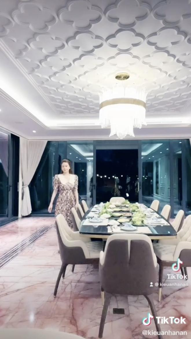 Theo những gì xuất hiện trong đoạn TikTok của Anan Nguyễn, khu vực phòng khách với trần siêu cao cùng chùm đèn khổng lồ, tất cả đều theo tone màu sáng sủa, hiện đại.