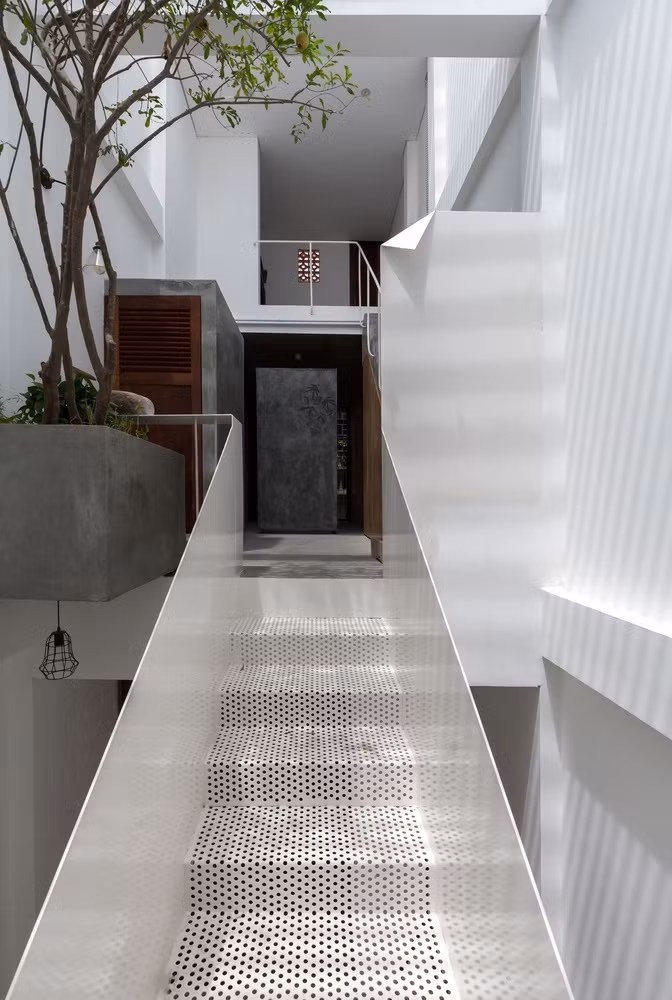 Mái nhà không xây kín mà thay vào đó những tấm mái thưa bằng kim loại để tận dụng tối đa ánh sáng tự nhiên từ bên ngoài.