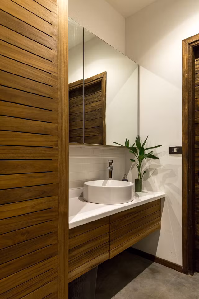 Để tạo cảm giác rộng rãi hơn cho ngôi nhà ống, các KTS đã sử dụng thiết kế lệch tầng cho ngôi nhà. Với thiết kế này, chẳng những nhà có cảm giác rộng hơn mà còn tạo cho các phòng cảm giác riêng tư hơn, dù sử dụng chất liệu kính cho mặt tiền. Ở một số phòng ngủ, KTS đã khéo léo sử dụng lam gỗ để tạo sự riêng tư cần thiết cho các thành viên trong gia đình.
