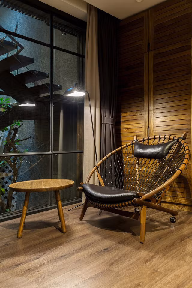 Do thiết kế lệch tầng, hệ cầu thang của ngôi nhà được thiết kế có độ dốc nhẹ. Trong các không gian sinh hoạt, chất xưa và hiện đại được đan xen hoàn hảo. Đan xen với những căn phòng toàn nội thất gỗ mộc hay hệ cửa bức bàn đúng chất xưa là những không gian mang tinh thần hiện đại, thư giãn đáp chí được yêu cầu cuộc sống. Tuy vậy nhờ chất liệu gỗ và nội thất mà các không gian vẫn giữ được sự đồng nhất.
