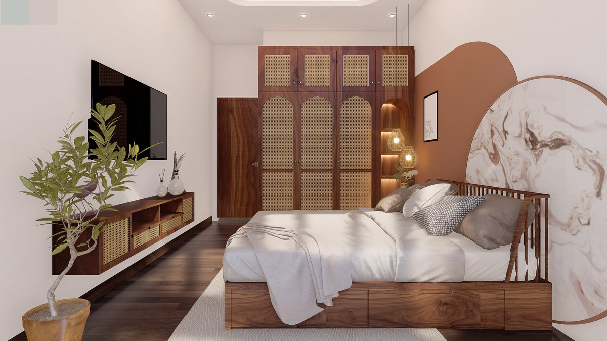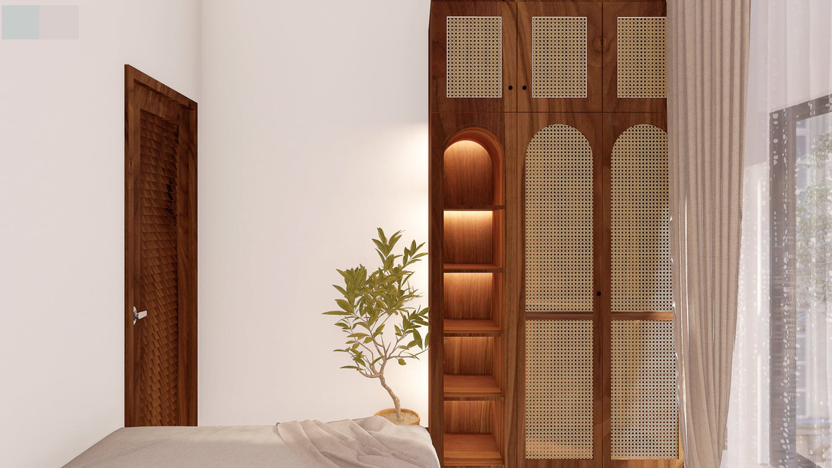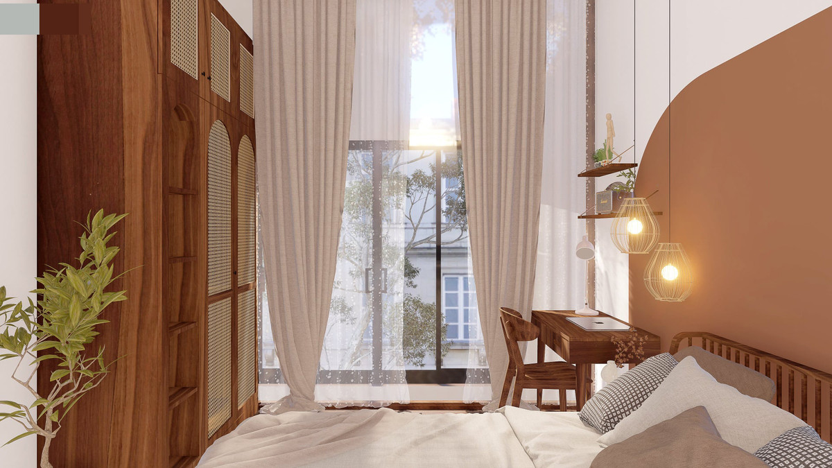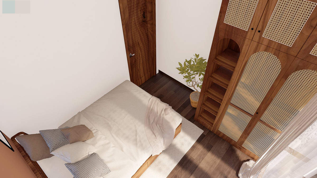 Phòng ngủ không rộng nhưng đủ công năng, tiện nghi và khá thẩm mỹ. Các chi tiết trang trí vừa đủ để không gian thật thoáng.