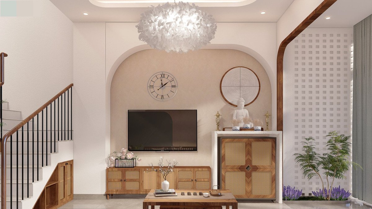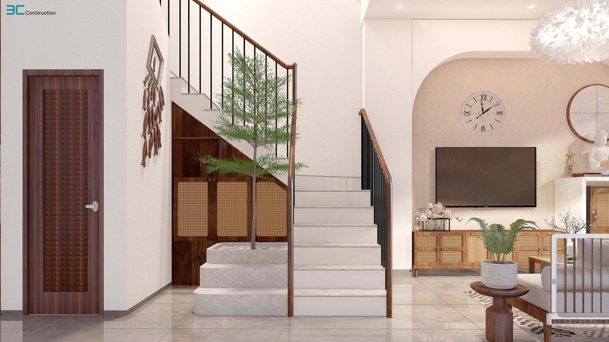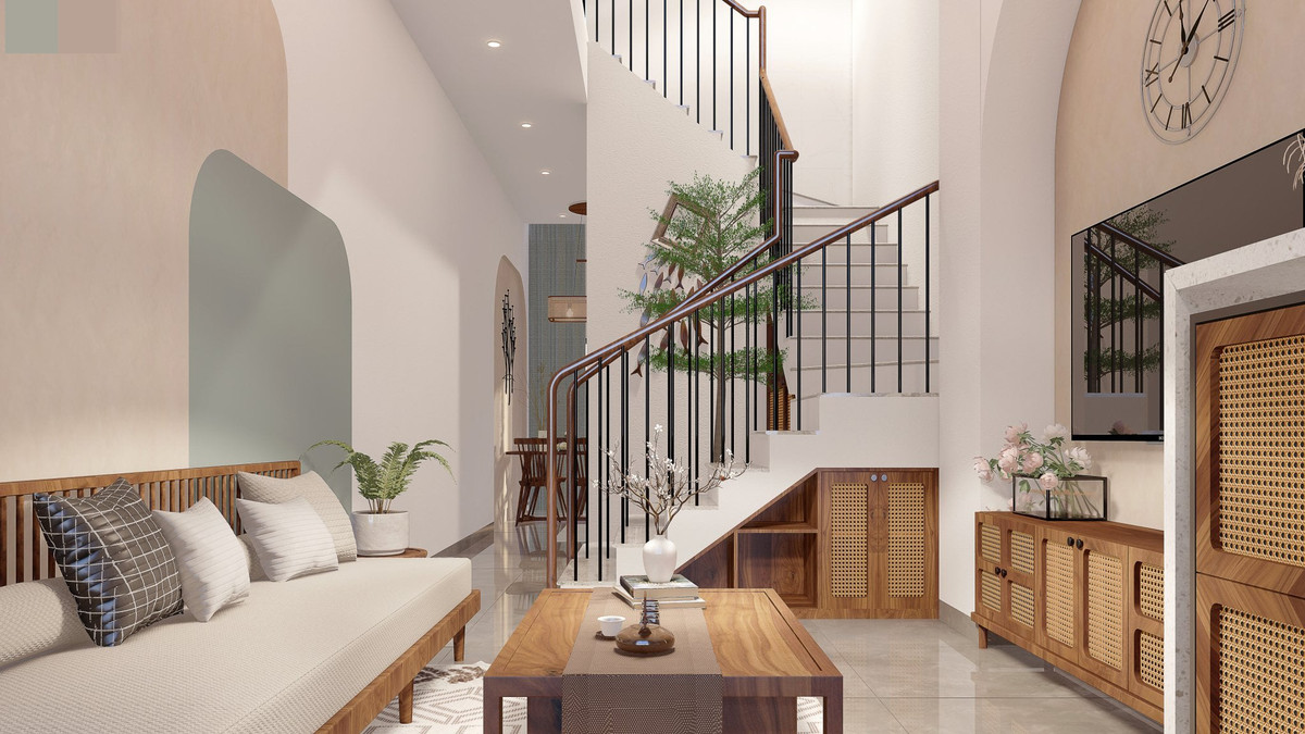Phòng khách và các không gian chuyển tiếp vào bếp, cầu thang lên tầng 2.