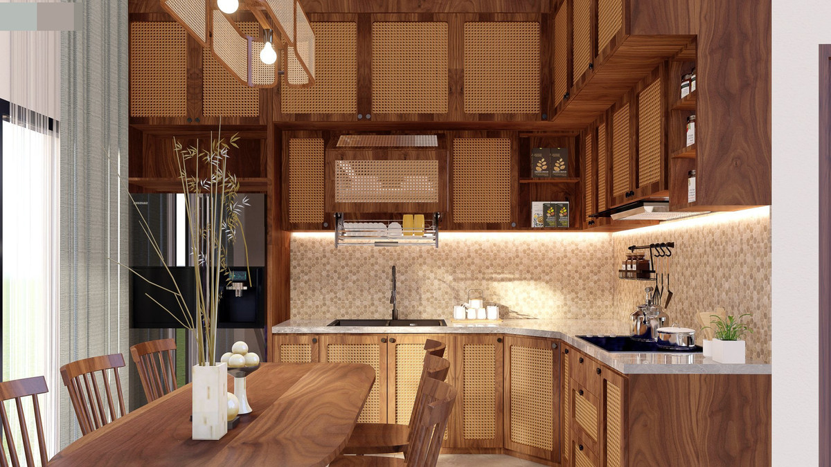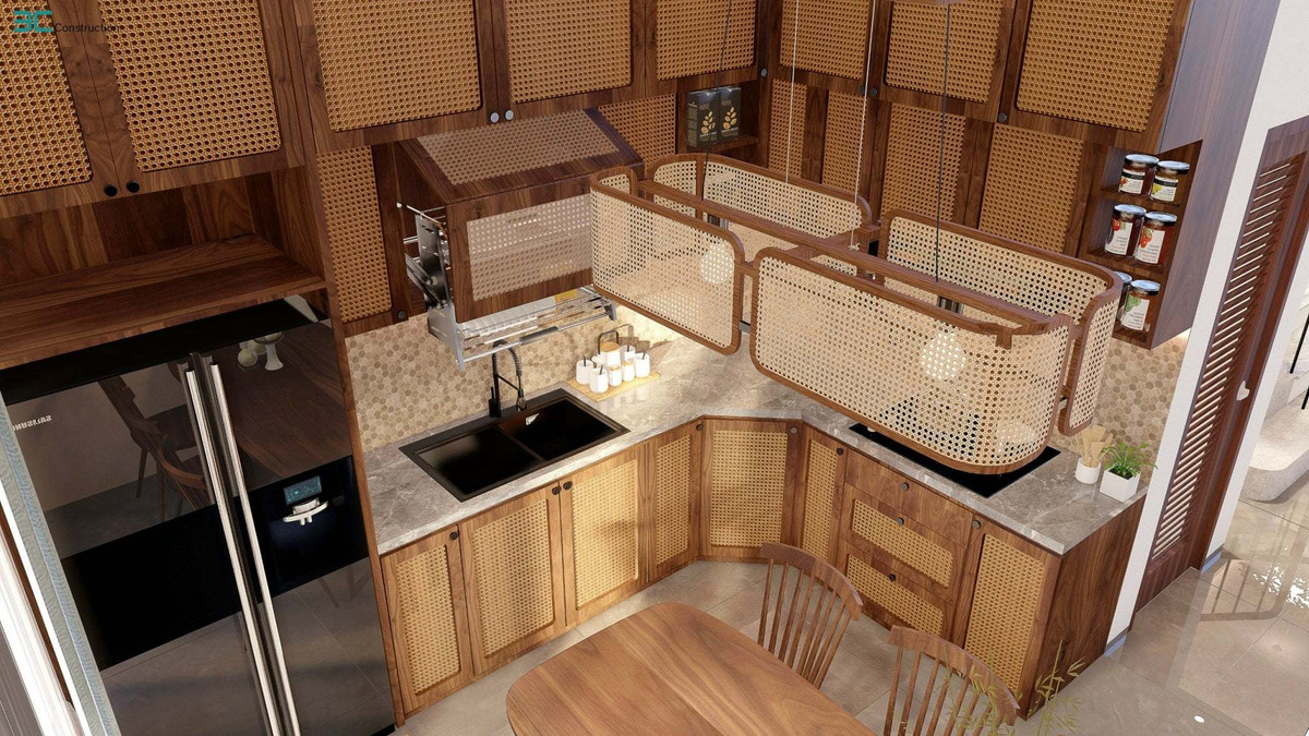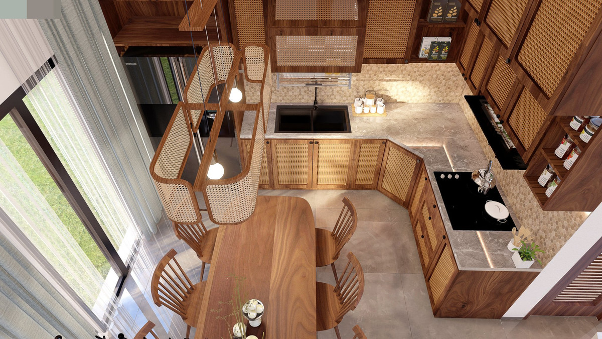 Phòng bếp riêng biệt, dùng tông màu gỗ ấm áp. Cánh tủ đan mây mắt cáo, hài hòa với bộ bàn ăn mộc mạc. Mặc dù là nhà phố nhưng kiến trúc sư Phan Hiển vẫn cố gắng tạo ra những khoảng không, vườn mini. Từ bếp, mở cánh cửa kính là có thể bước ra vườn nhỏ, lấy ánh sáng.