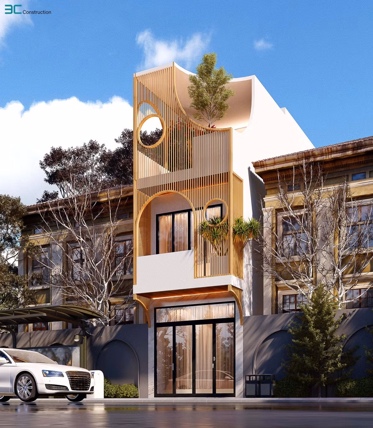 Mặt tiền lạ mắt, thiết kế lam cản nắng đồng thời tạo sự độc đáo cho nhà.