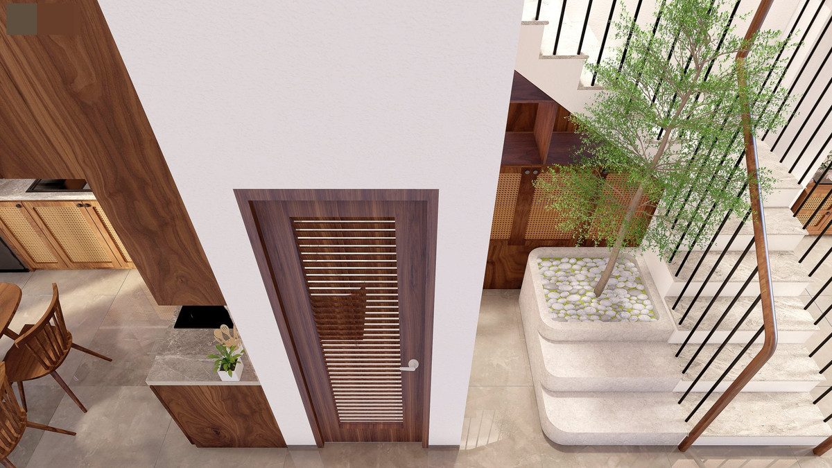 Gầm cầu thang được tận dụng làm tủ đựng đồ, tủ giày. Phía trên là giếng trời nên cây xanh được bố trí để lọc khí.