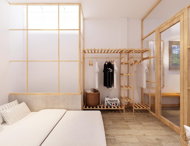 Tầng 2 được thiết kế làm không gian riêng tư, bao gồm phòng ngủ và tủ áo quần với phong cách đơn giản, bằng cách sử dụng những thanh gỗ thông nhẹ nhàng nhưng rất chắc chắn.