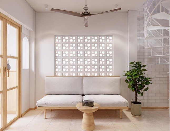 Ở phòng khách, do gia chủ mong muốn làm như 1 phòng khách bình thường, nên KTS đã đập khoảng tường trống phía sau sofa để làm ô thông gió, nhằm làm cho ngôi nhà được thông thoáng và có nét thẩm mỹ.