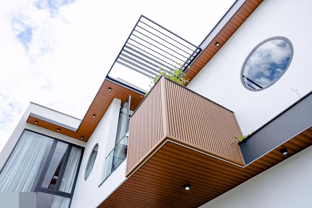 Mặt tiền và ngoại cảnh được chăm chút tỉ mỉ. Phần hiên nhà và hành lang ốp lam gỗ nhựa màu nâu vàng làm điểm nhấn. Những khung cửa tròn lấy sáng phảng phất chút truyền thống nhưng không làm mất đi sự trẻ trung của công trình. Cây xanh đưa đến cảm giác mát mẻ, trong lành.