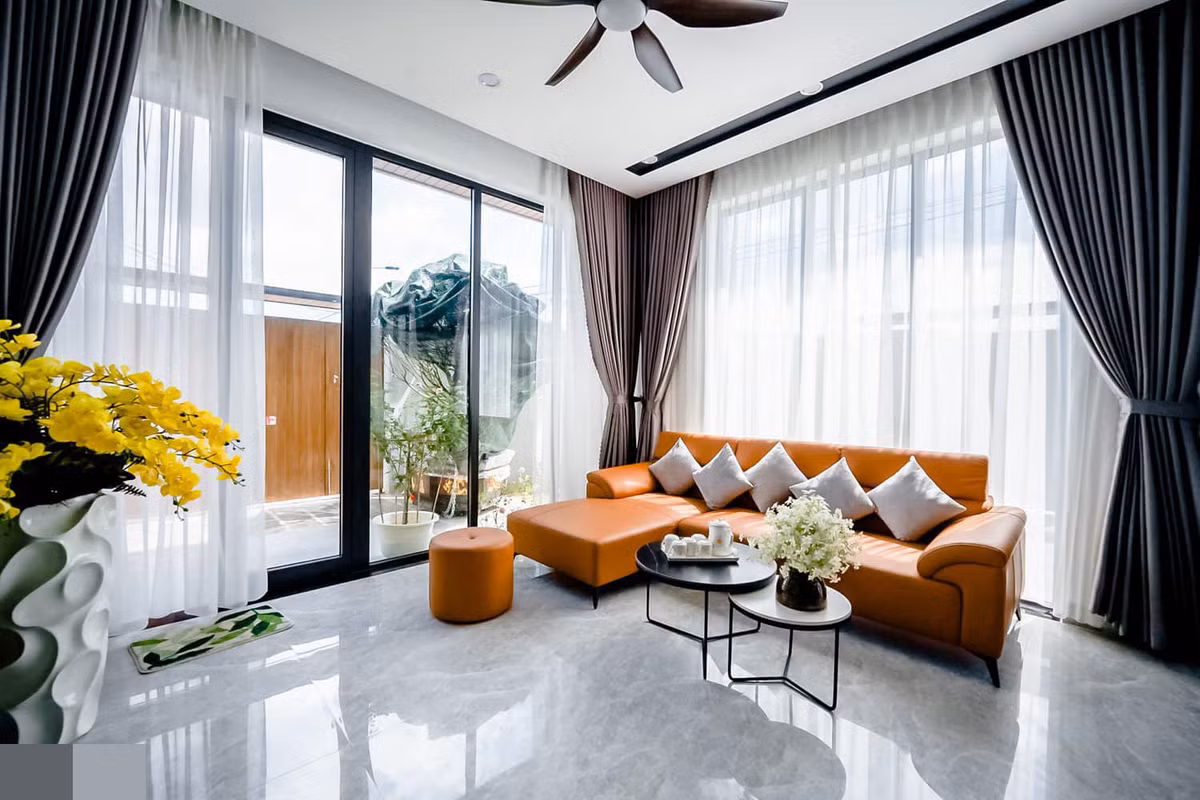 Màu cam của sofa phối với màu xám của rèm cửa, sàn nhà tạo nên sự tương phản rõ nét.