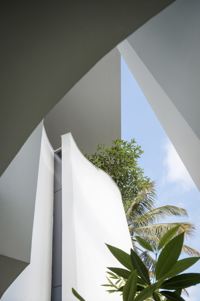 Mặt tiền uốn lượn giúp ngôi nhà trở nên mềm mại, và có nhiều khoảng hở để ánh sáng và gió có thể đi sâu vào bên trong, giúp mọi không gian luôn sáng và thoáng.