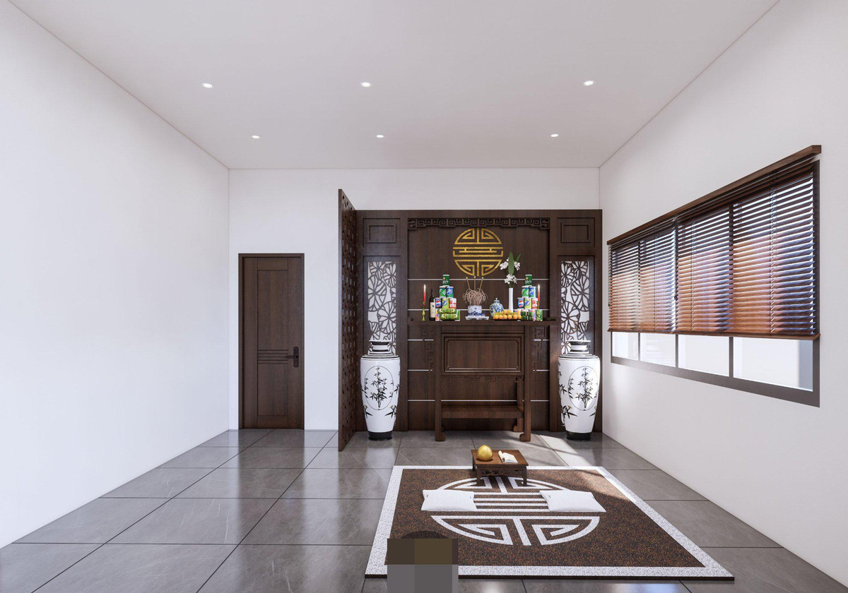 Phòng thờ được thiết kế trang nghiêm, bố trí bộ ghế sofa, thuận tiện cho gia chủ khi cần yên tĩnh, hoài niệm về ký ức xưa hoặc đơn giản là thưởng thức tách trà thơm lừng trong không gian linh thiêng.