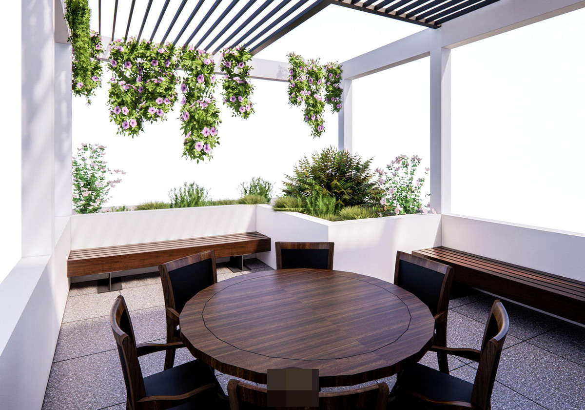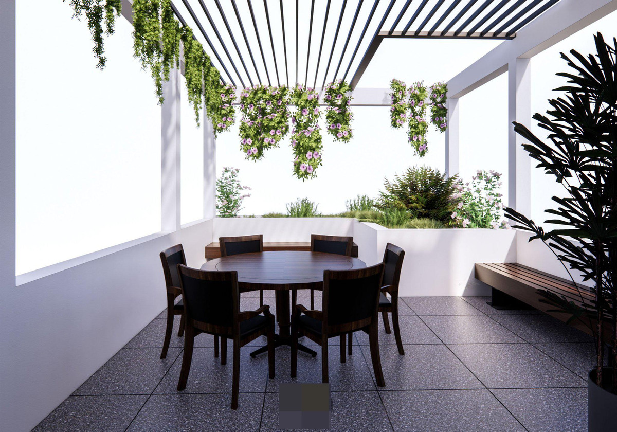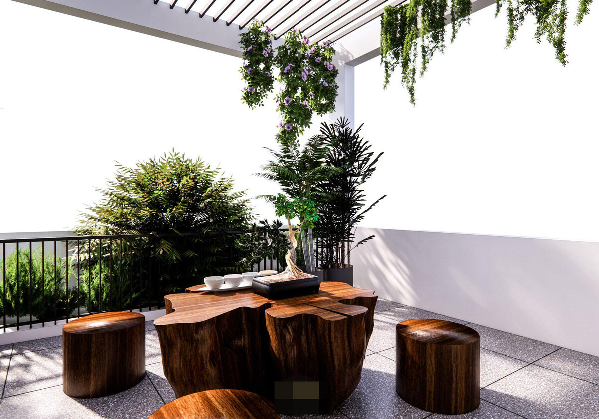 Sân thượng trước và sau có sự phân bổ mảng xanh hợp lý. Hàng rào trúc xanh tốt còn mang ý nghĩa về mặt phong thủy, tượng trưng cho phúc, lộc dồi dào, hạnh phúc, đoàn viên.