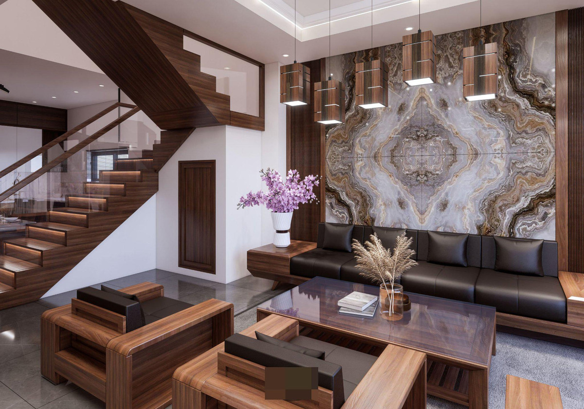 Phòng khách sử dụng nội thất gỗ óc chó sang trọng, màu sắc tinh tế. Khung cửa kính là giải pháp lấy ánh sáng và nguồn gió hiệu quả cho nhà phố.