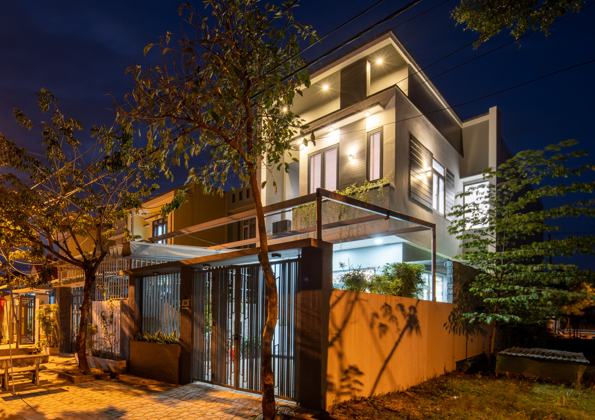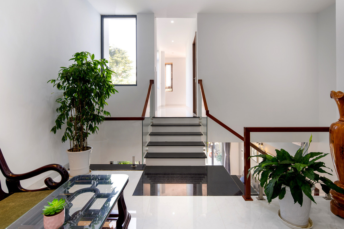 Phần sân sau 2m để cung cấp view và khí tươi cho phòng ngủ chính. Lồng ghép khéo léo giữa không gian ở và các không gian xanh, các không gian xanh có vai trò đối lưu gió và cung cấp ánh sáng tự nhiên và năng lượng cho toàn bộ công trình.