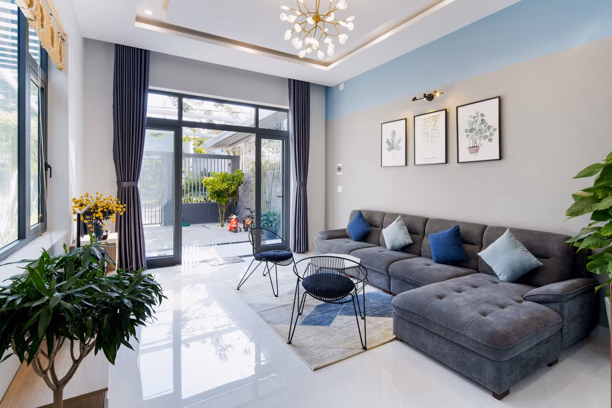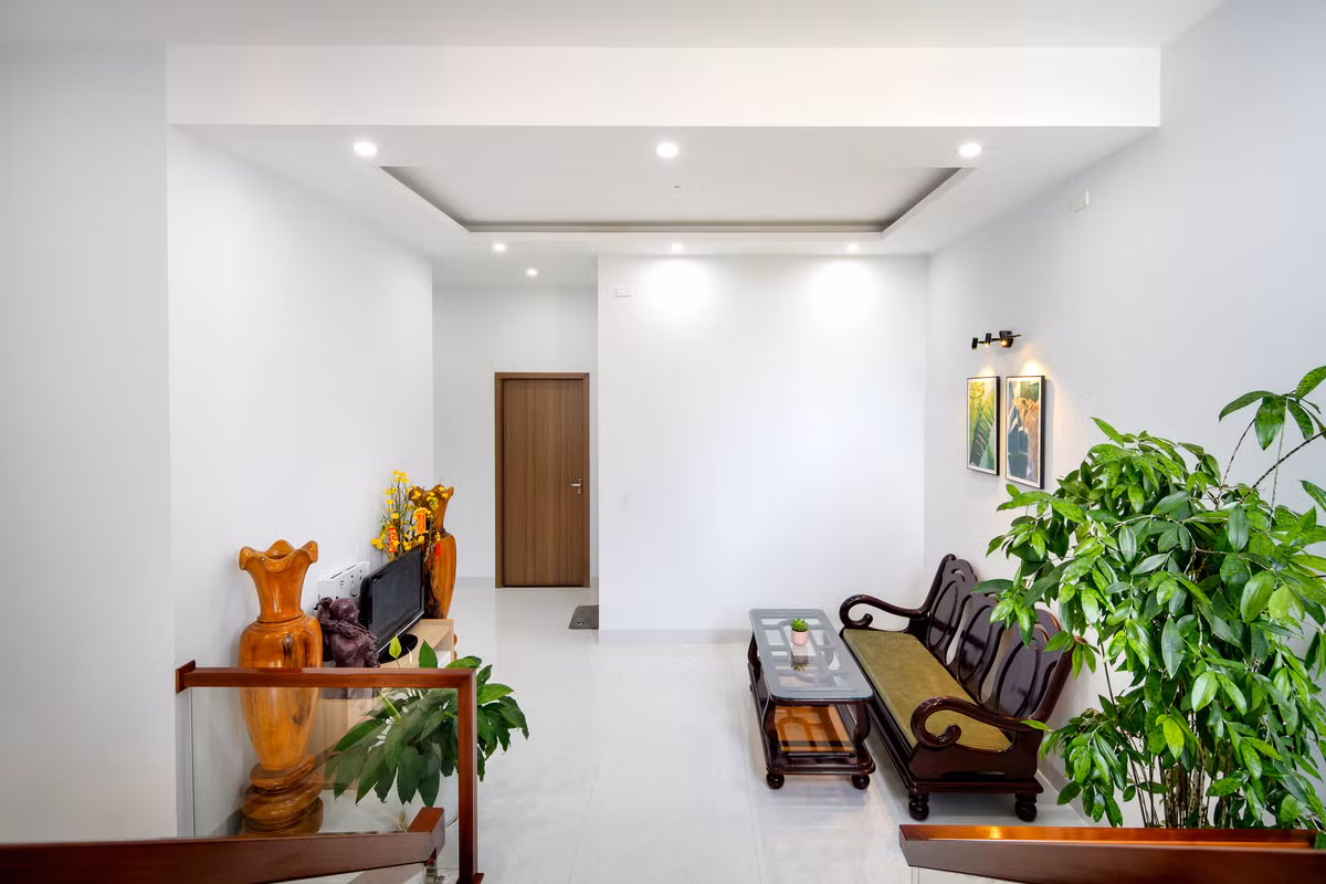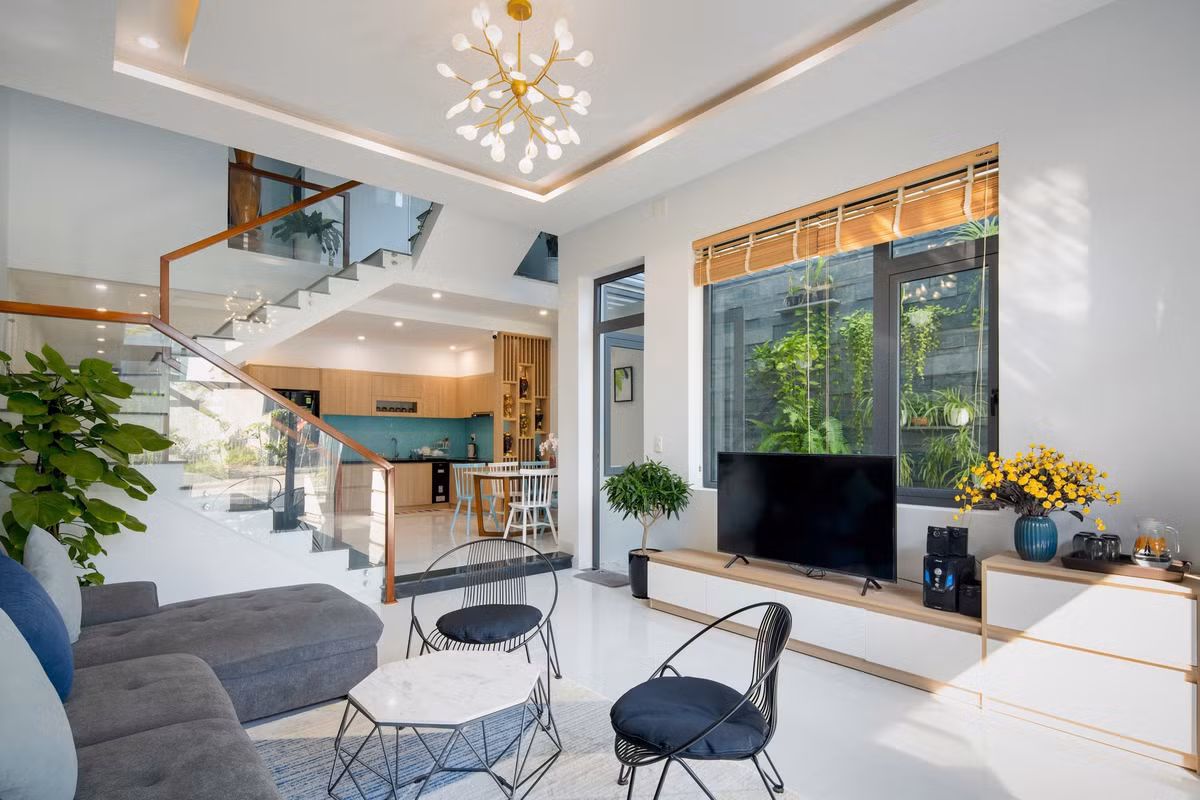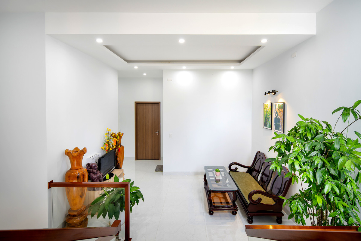 Sân trước 6m, sân sau 2m, phòng khách được thiết kế chừa một khoảng nhỏ cung cấp ánh sáng và view tầm mắt cho phòng khách giúp cảm giác rộng rãi và thoáng đãng.