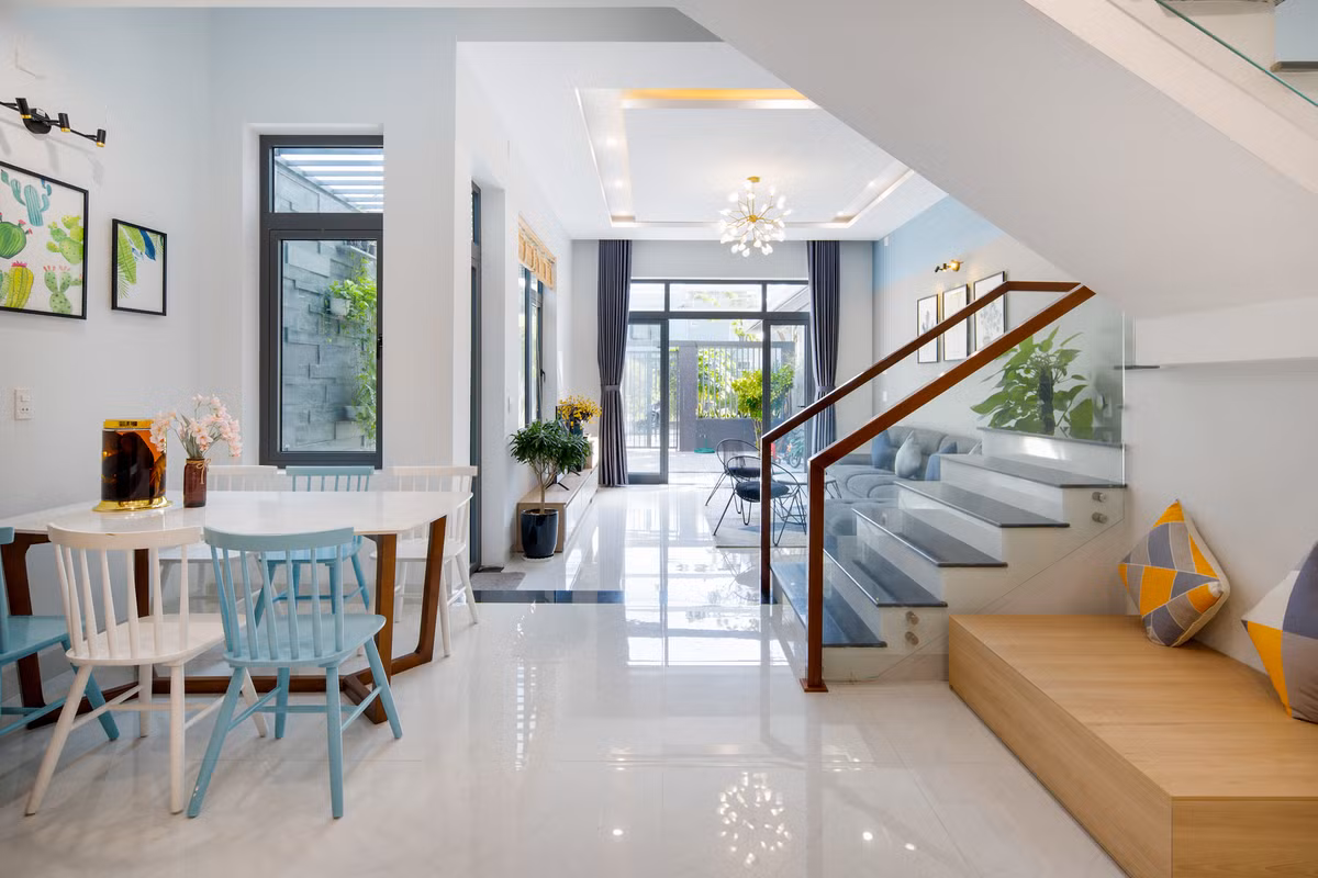 Đây cũng là chỗ cung cấp ánh sáng cho bếp và bàn ăn mà không cần giếng trời. Kiến trúc sư Nguyên Tương chia sẻ, đối với điều kiện khí hậu ở miền Trung, giếng trời chiếu xuống sẽ khá nóng và thường bị sự cố thấm giọt vào những mùa mưa bão khó xử lý.