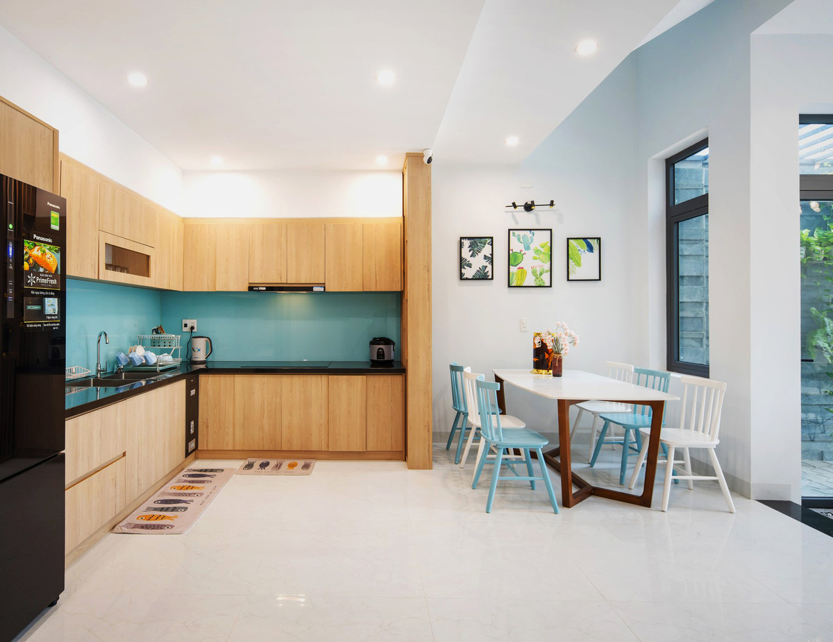 Bếp luôn có khí tươi nhờ thiết kế các khoảng không trước sau. Đây là nơi gắn kết gia đình qua những bữa ăn ấm cúng nên được bố trí các mảng màu nhã nhặn, dễ chịu, tạo cảm giác thư thái.